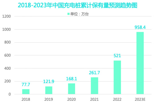 2022年新能源汽车保有量1310万辆,车桩比为2.5:1,新能源汽车销量为688.7万辆,车桩增量比为2.7:1。未来新能源汽车行业的发展将带动充电桩数量快速增长,预计2023年中国充电基础设施累计数量将达到958.4万台。
