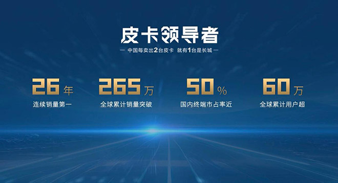 作为行业领导者,长城皮卡已连续26年销量第一,全球累计销量突破265万辆。国内终端市占率近50%,中国每卖出两台皮卡,就有一台是长城。长城炮更是在短短5年间,持续以“长城炮速度”刷新行业纪录,成为首个突破60万的中国高端皮卡品牌,已累计49个月销量过万,蝉联中国皮卡销量冠军。